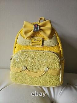 NWT Loungefly Disney Beauty and the Beast BELLE sequin backpack. An enchanting journey awaits you with this exclusive Loungefly Disney Beauty and the Beast Belle Sequin Mini Backpack! Elegant details in sequins of gold bring Belle's signature ballgown-look to life on this backpack.
