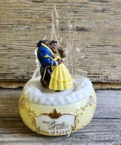 It is in excellent working order and ready to be treasured for years to come. It features a beautifully detailed acrylic ice castle atop glitter snow and Beauty in her yellow gown dancing around with The Beast out front in a circle of snow. Round base 3.5 in. Sanyo is written on the metal wind-up. Be careful not to wind too tight.